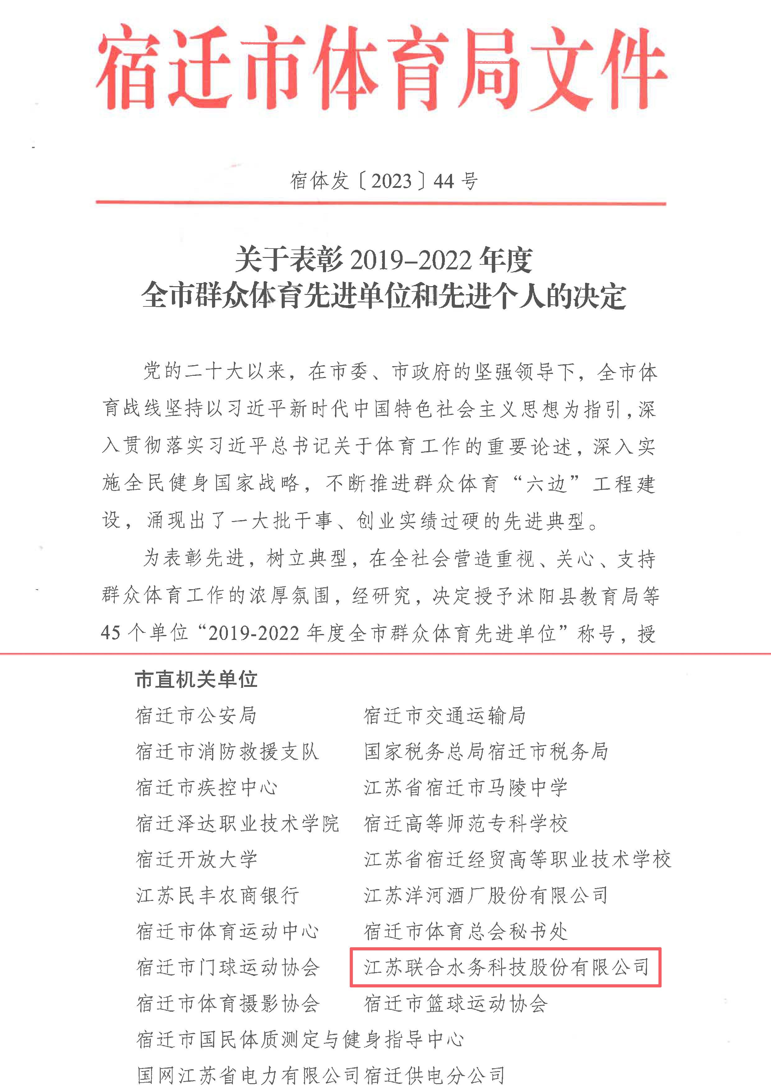 近日,宿遷市體育局發(fā)布《關于表彰2019-2022年度全市群眾體育先進單位和先進個人的決定》,江蘇聯(lián)合水務科技股份有限公司(下稱“聯(lián)合水務”)榮獲“全市群眾體育先進單位”稱號。