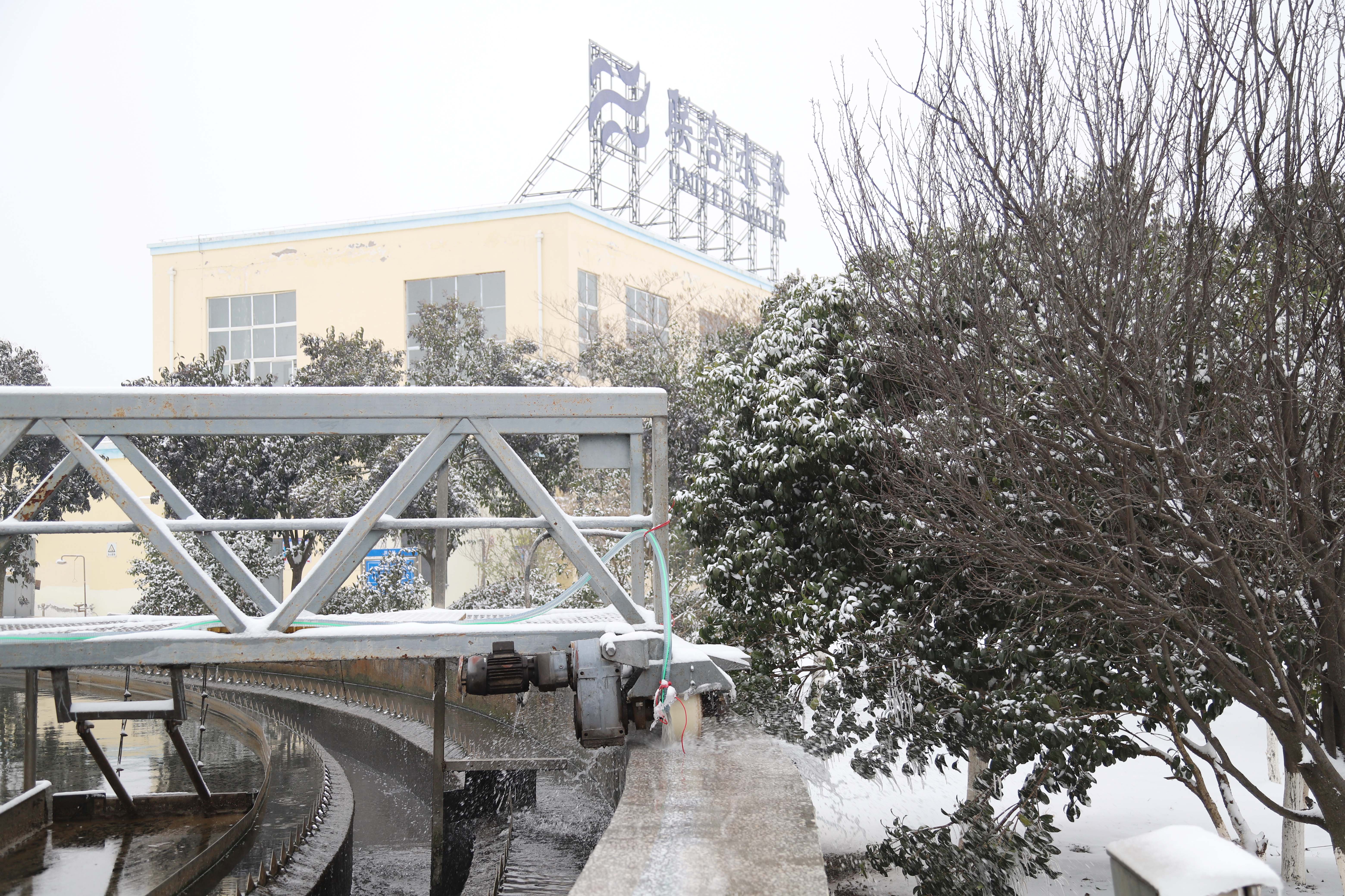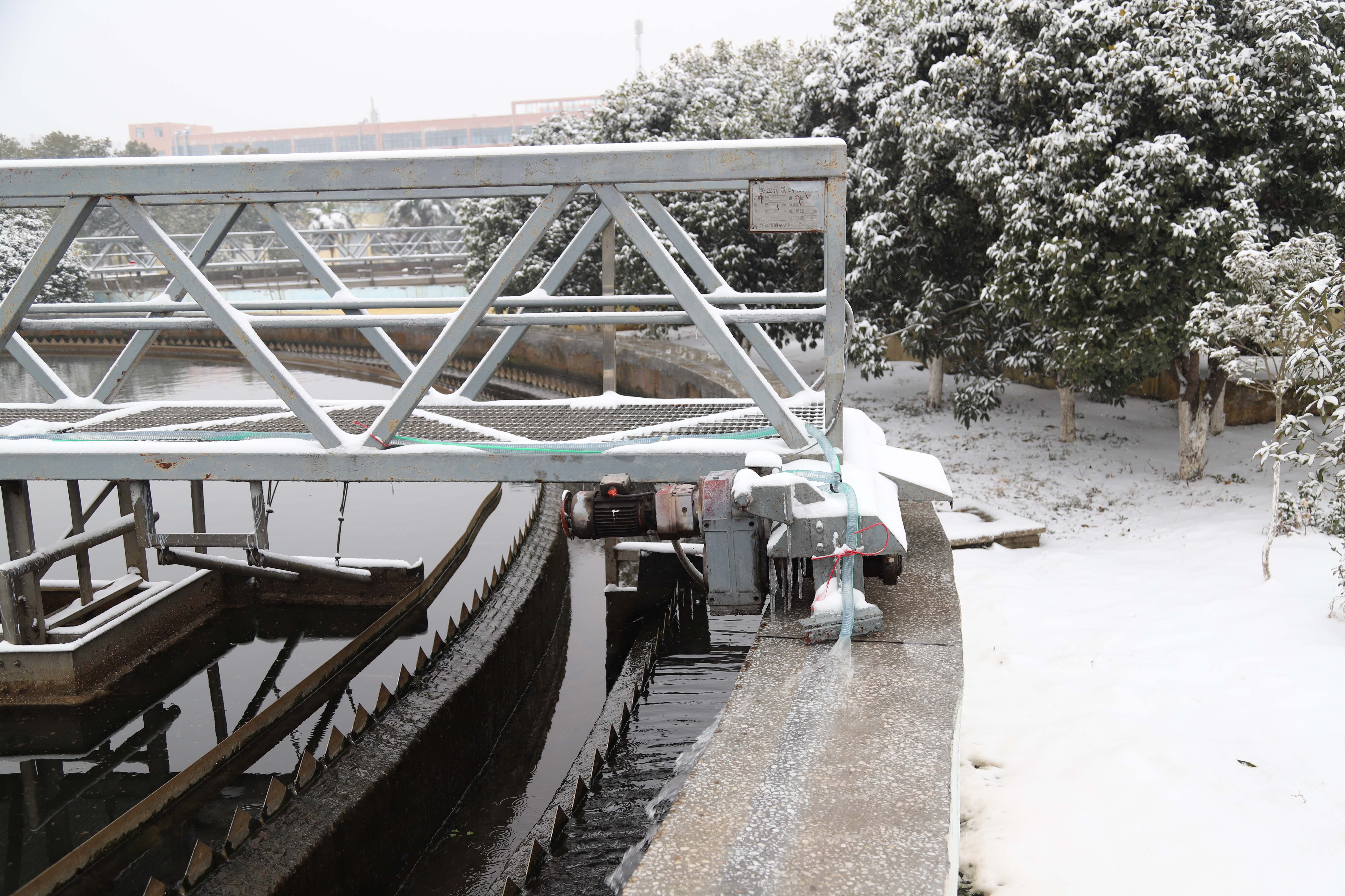 污水處理工作不僅關(guān)系著生態(tài)環(huán)境,也是關(guān)系著千家萬戶的民生大事,寒潮天氣下,隨州公司生產(chǎn)人員冒著風(fēng)雪進(jìn)行重點(diǎn)地巡檢,通過巡檢觀察污水處理廠各工藝單元的感官現(xiàn)象和指標(biāo),初步判斷水質(zhì)的變化和運(yùn)行是否正常、穩(wěn)定,重點(diǎn)設(shè)備是否正常運(yùn)行。在巡檢的過程中,生產(chǎn)人員發(fā)現(xiàn)一期四座二沉池下方輪子出現(xiàn)打滑空轉(zhuǎn),二沉池運(yùn)轉(zhuǎn)停止的情況。雪落在行走軌道上,被行走輪壓實(shí)后,形成雪層,造成行走輪的打滑,使刮泥機(jī)長(zhǎng)時(shí)間在一個(gè)位置運(yùn)行,池底的污泥無法全部排出,造成工藝運(yùn)行的異常,需要及時(shí)清理干凈軌道表面的冰層。發(fā)現(xiàn)問題后,生產(chǎn)各部門緊急召開臨時(shí)會(huì)議,制定解決方案,最終決定安裝水泵,從池子抽水澆注在軌上道,保障軌道正常運(yùn)行。