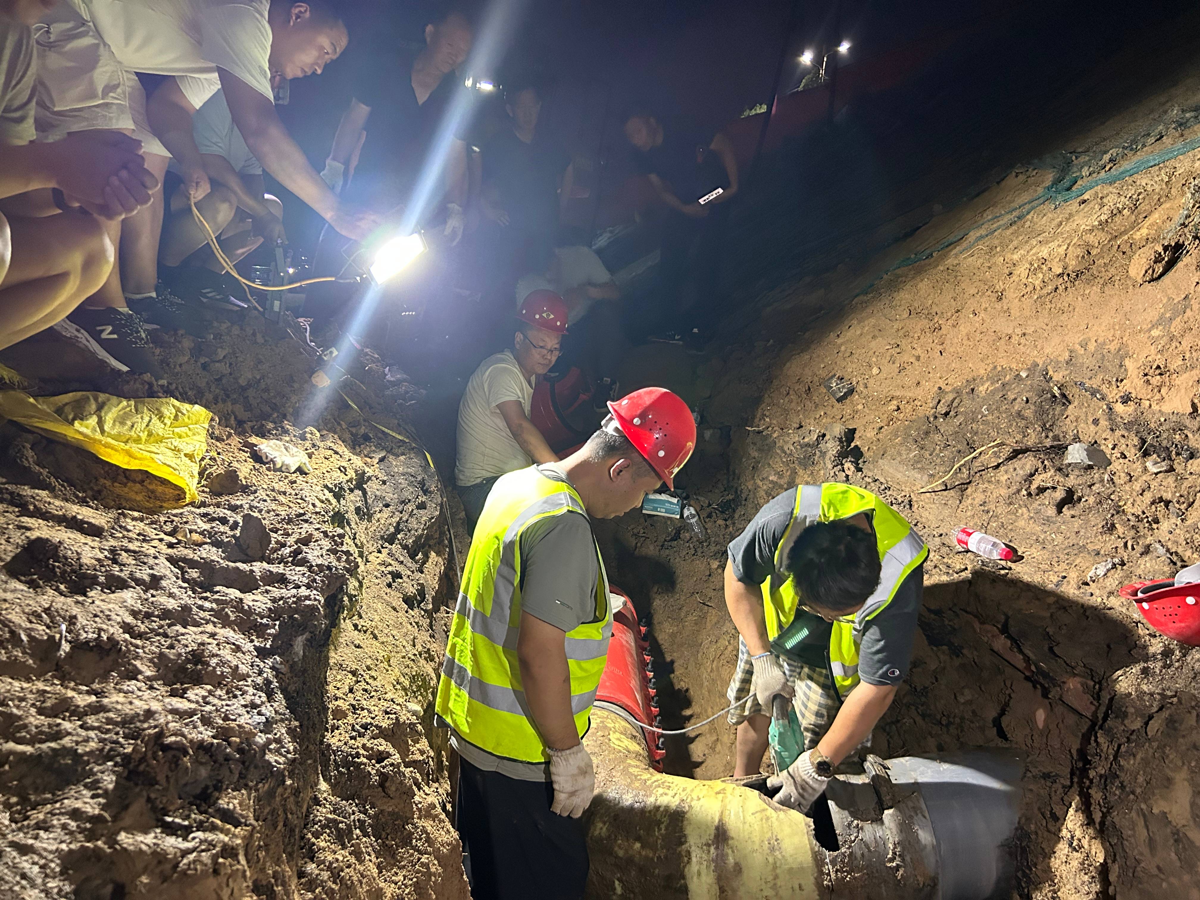 搶修現場,燈火通明,數十名搶修人員身穿反光背心,頭戴安全帽,在緊張的氛圍中忙碌著。他們分工明確,有續的關閥門、開挖、找漏點、排水一道道工序有條不紊地鋪開,時間一分一秒過去,但搶修人員的腳步從未停歇,他們深知每一秒的延遲都意味著市民的等待與不便。在緊張的搶修過程中,大家齊心協力,客服重重困難,展現水務人勇于擔當、無私奉獻的精神風貌。他們顧不上汗水浸濕衣袖,在布滿泥水的狹小空間中進行維修作業。經過近8個小時的全力奮戰,7月26日凌晨3時10分,破損管線基本修復完畢,縣城區域逐步恢復供水。