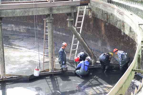 針對設備損壞可能導致的分離效率下降及停機風險,隨州公司立即啟動《關鍵設備故障應急預案》與《有限空間作業安全預案》,成立由生產部、機電部組成的專項維修及安全小組。維修小組結合現場勘查情況,制定“抽水降位-結構加固-功能測試”三步實施方案,安全小組同步落實氣體監測、通風防護、人員監護等安全管控措施,為檢修作業建立技術與安全雙防線。按照既定方案,2臺排污泵在智能系統調控下24小時內完成池體排水,工作人員全程監測水位變化及周邊設施安全。抽水完成后,維修人員穿戴全套防護裝備進入池內,依次拆除更換破損刮板,對變形桁架進行回正加固并完成焊接修復,并同步清理池底沉積異物。經多輪檢查確認安裝及焊接質量達標后,逐步恢復通水調試,確保二沉池各項運行參數均符合標準。