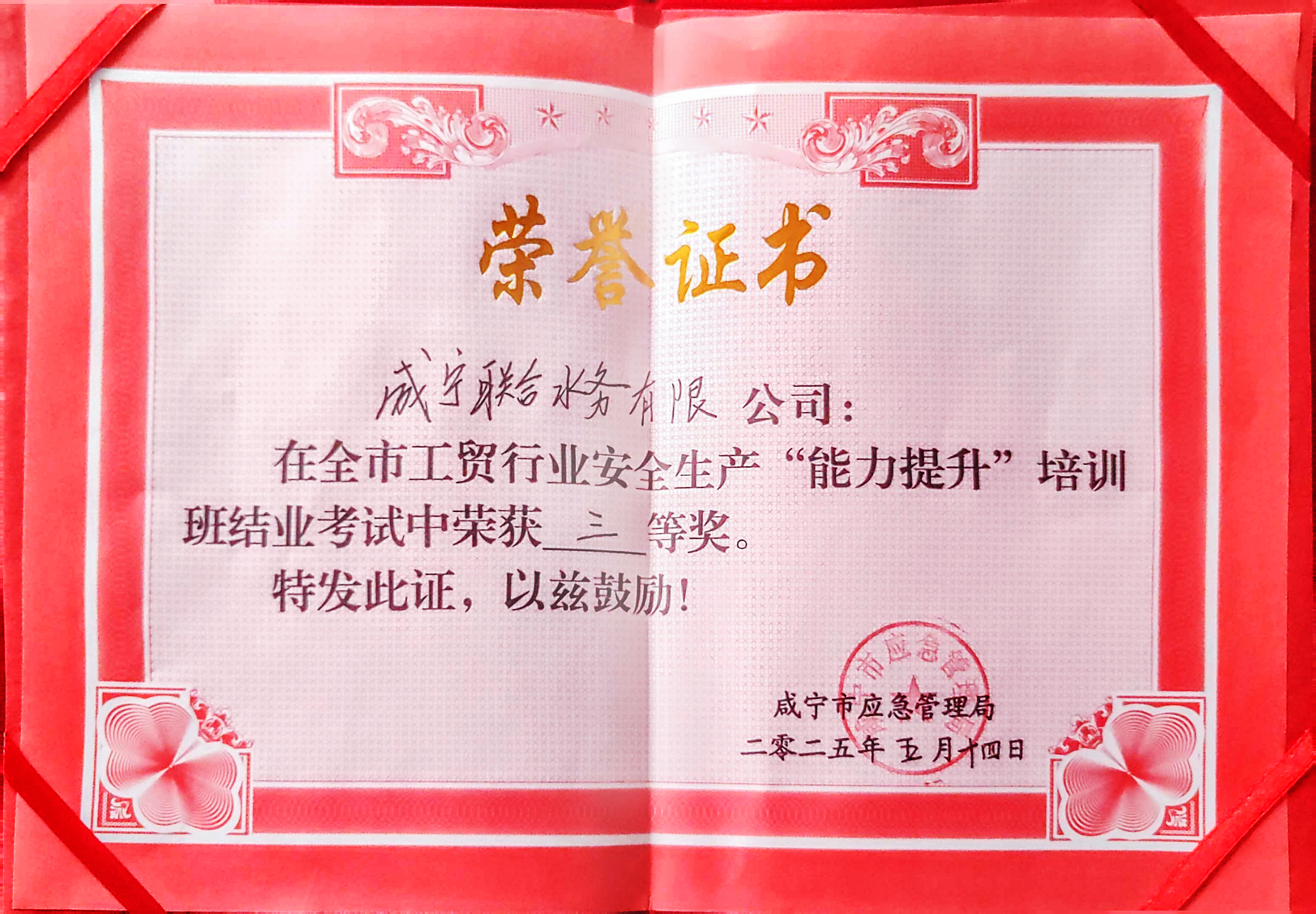 喜報|咸寧聯合水務員工榮獲咸寧市工貿行業安全生產“能力提升”培訓班結業考試三等獎 | ||