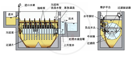 當水流經濾布進入過濾段時,水中的懸浮物被除去,固體留在濾布上。過濾后的水通過中央軸、上升豎井和溢流堰流出裝置。隨著固體顆粒在濾布上的堆積,過濾單元上的液壓阻力增大,從而使濾槽內的水位升高。