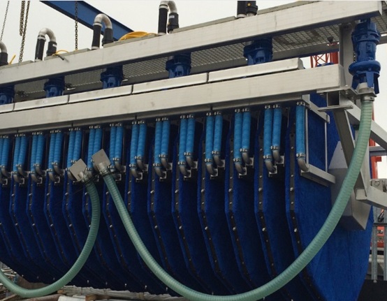 當濾池內水位達到與濾液水位相差25 cm的水位時,開始進行濾池清洗。在較低的過濾器負荷,過濾器清洗將啟動時間控制(一般每2小時)。圓盤過濾器緩慢旋轉(1 - 2轉/分鐘),固體通過吸力裝置移除。