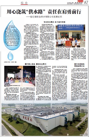 建市以來(lái),在市委市政府的關(guān)心支持下,宿遷銀控自來(lái)水有限公司歷經(jīng)十二年改革發(fā)展,用心編織城市供水安全網(wǎng),有力保障了我市供水安全優(yōu)質(zhì)。值建市20周年即將來(lái)臨之際,宿遷供水人在以更飽滿的熱情、更優(yōu)質(zhì)的服務(wù),投身到宿遷供水事業(yè)發(fā)展的同時(shí),更不忘肩頭擔(dān)負(fù)的社會(huì)責(zé)任,奮力前行,在宿遷投資供水設(shè)施近8億元人民幣,為我市的高速發(fā)展做出新的更大的貢獻(xiàn)。